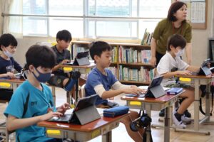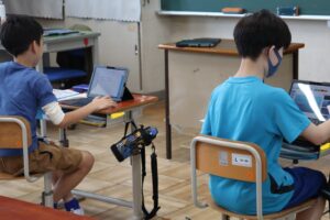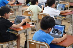 一人一台ずつ使うことができるタブレットパソコン。日常の学習道具として多くの時間に使われています。