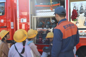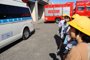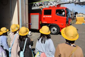 3年生が、社会科「安全なくらしを守る」の学習で蟹江消防署を見学しました。消防署にある様々な車や車内にある道具などを見せていただき、それぞれの役割を教えていただきました。また、実際に使う場面を見たり、触ったりして、教科書に書かれていたことや写真で見たことをより詳しく知ることができました。