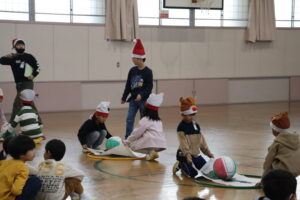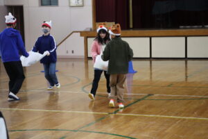サンタクロースに扮した児童会役員によるデモンストレーションを見た後、プレゼントに見立てたボールを二人一組で運び、アニマルサンタの帽子をバトン代わりにリレーをしました。