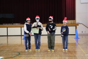 12月5日(金)の児童集会では、児童会企画として、「もうすぐクリスマス!サンタも修行中」と題した縦割り班対抗リレー大会が行われました。