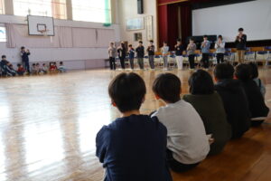 続いて、1年間お世話になった縦割り班の6年生に、班員一人一人が書いたメッセージカードの綴りを渡すと、6年生からリコーダー演奏のお返しがあり、その澄んだ音色に皆、聴き入っていました。