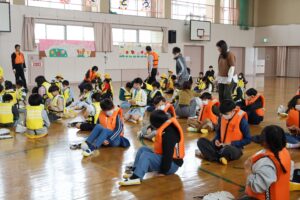 その後、運動場から体育館へ移動し、ライフジャケットの着脱の練習をしました。